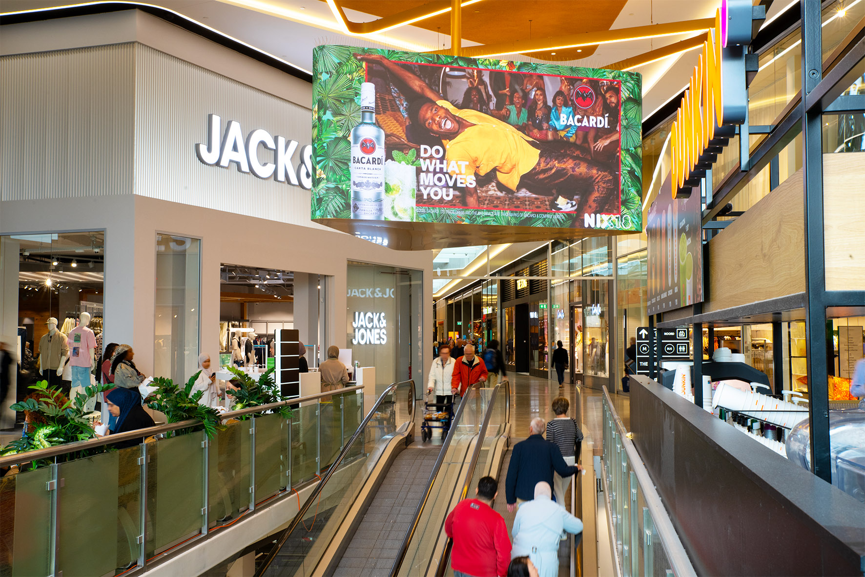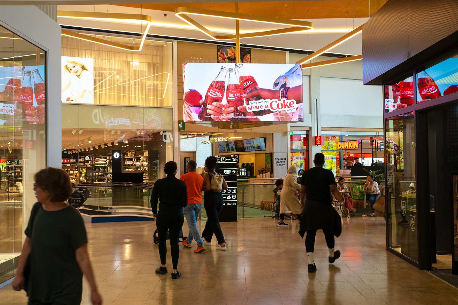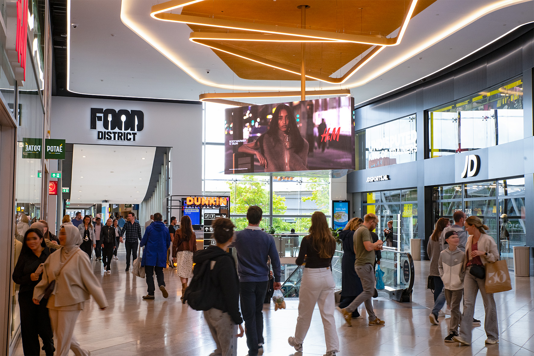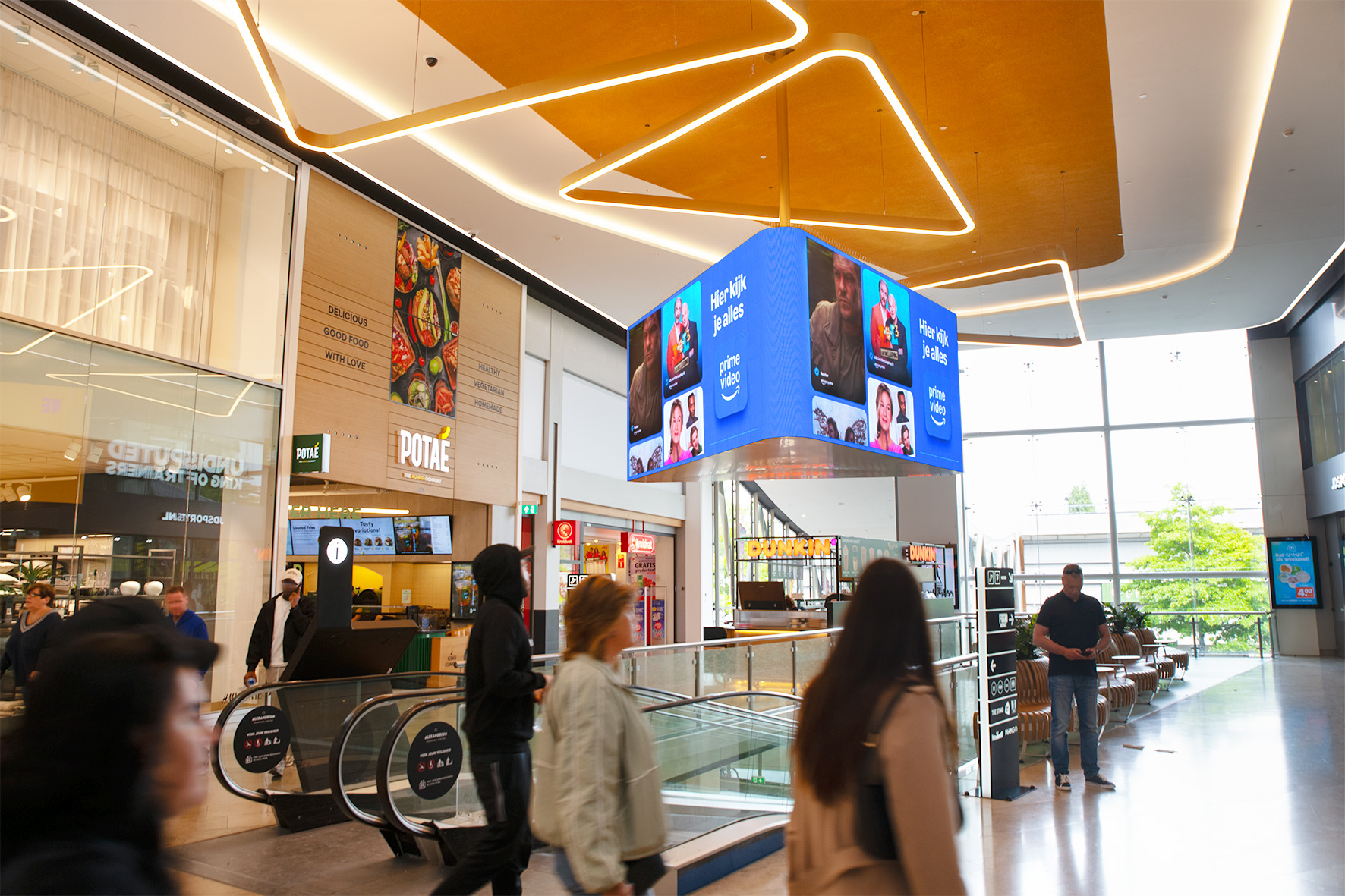 ALEX is the digital landmark of the vibrant Alexandrium Shopping Centre in Rotterdam. This three-sided 21m² LED screen dominates the central junction where three shopping streets converge. A wide audience shops in this retail environment: young families, fashion enthusiasts and trendsetters, the ideal mix for brands aiming to be seen at the decisive moment of purchase. With ALEX, brands enjoy maximum creative freedom. Campaigns can run separately on each screen or be activated as one dynamic whole. A consistent design, branding across all sides and 360° moving graphic elements deliver a premium DOOH campaign that stands out from any other screen.