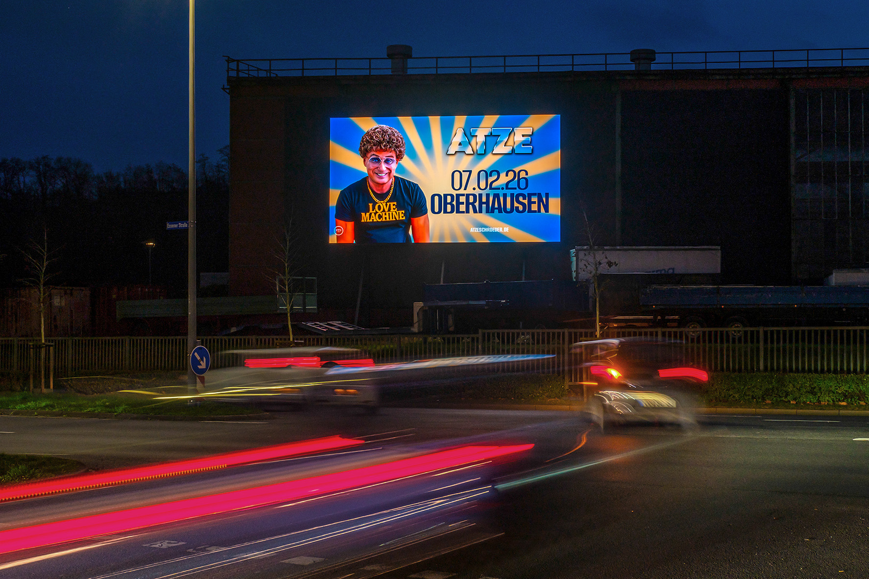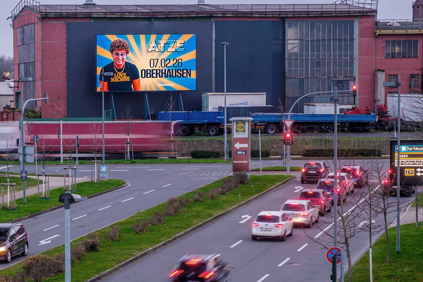 This Super Motion screen with high frontal visibility is located at the high-traffic intersection of Essener Straße and the access roads for the car parks at CentrO in Oberhausen. With 23 million visitors a year, CentrO in Oberhausen is Europe’s largest shopping and entertainment centre and attracts visitors from throughout the German state of North Rhine-Westphalia to the Ruhr valley. Regular traffic congestion near the digital screen location leads to longer viewing times and intense contact with your advertising message. The immediate vicinity of the Super Motion offers a wide range of attractions, such as various exhibitions at Gasometer, the multifunctional König-Pilsener-Arena, the Sea Life aquarium, the Metronom Theater, a multiplex cinema, the Aquapark water park and a wide selection of restaurants and clubs.