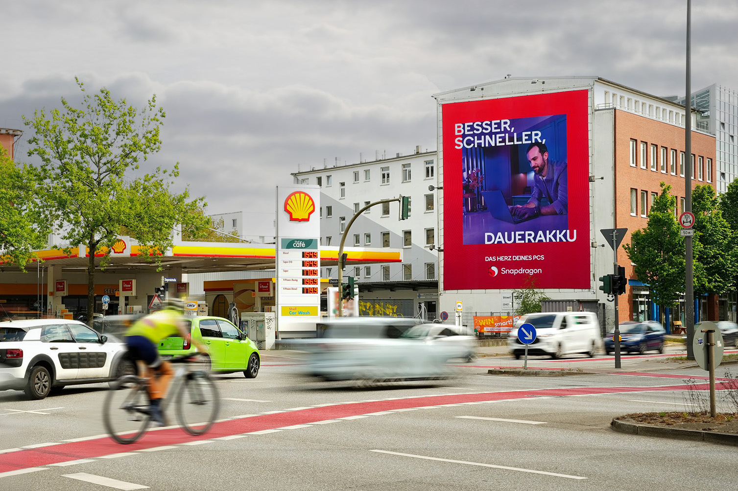 This traffic giant is located directly at the intersection of Eiffestraße and Diagonalstraße in the heart of Hamburg's Hamm district. The nearby educational institutes such as the Hanseatic Business School and various office buildings attract an above-average educated target group of young professionals and students to the urban residential area. Europe's largest allotment garden, various parks and playgrounds also make the neighbourhood a green idyll for young families. The four-lane intersection is one of the most important main traffic routes to Hamburg's city centre with a high volume of commuters.