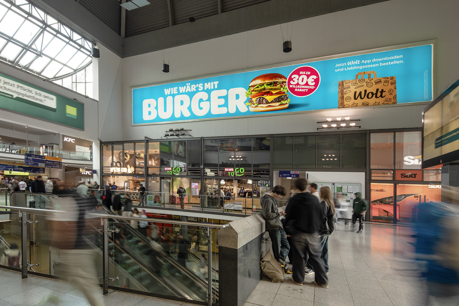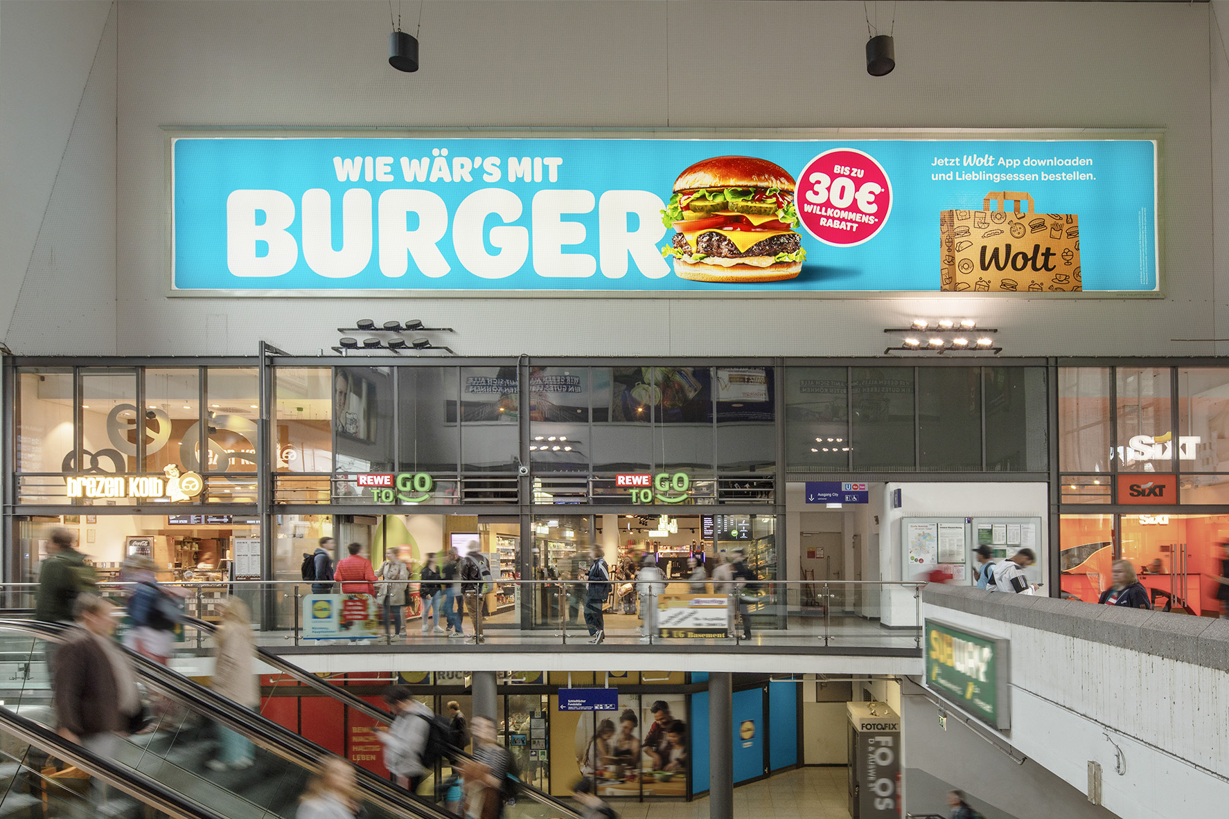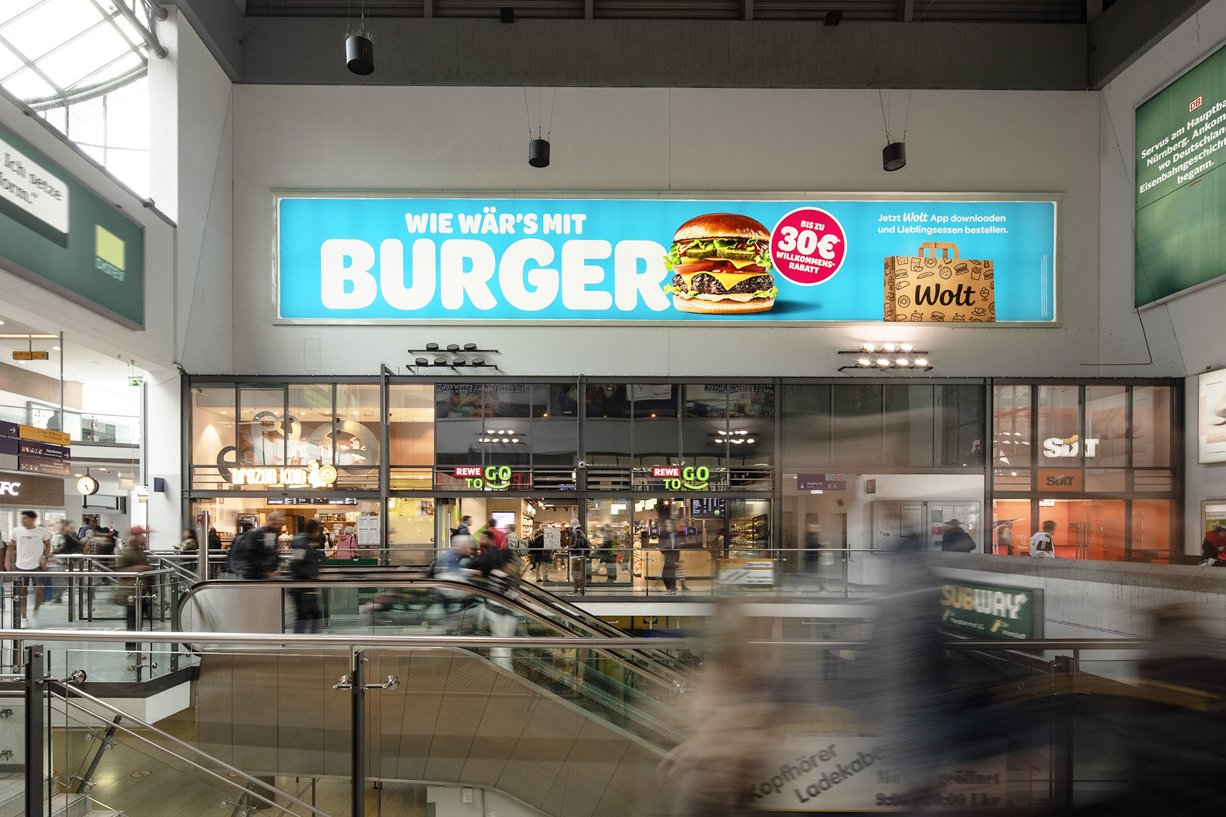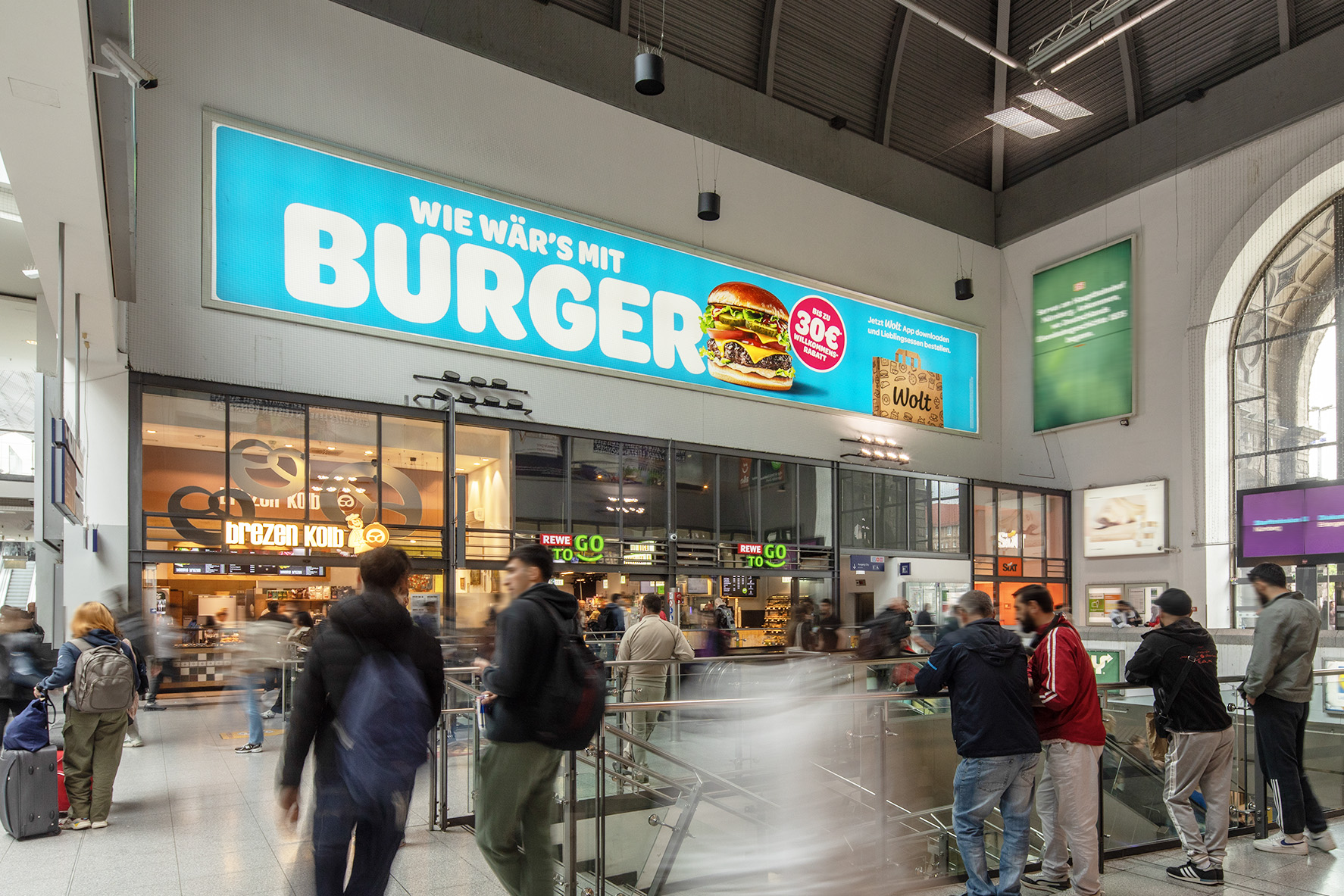 This Giant Poster is located in the entrance hall of Nuremberg Central Station, one of the busiest railway stations in Germany with over 210,000 travellers a day. Around 800 long-distance and regional trains, as well as local public transport, generate traffic every second. Brands reach a lucrative target group here: business travellers and commuters who frequent the station just as much as shopping fans who are drawn to the nearby old town for extensive shopping trips.