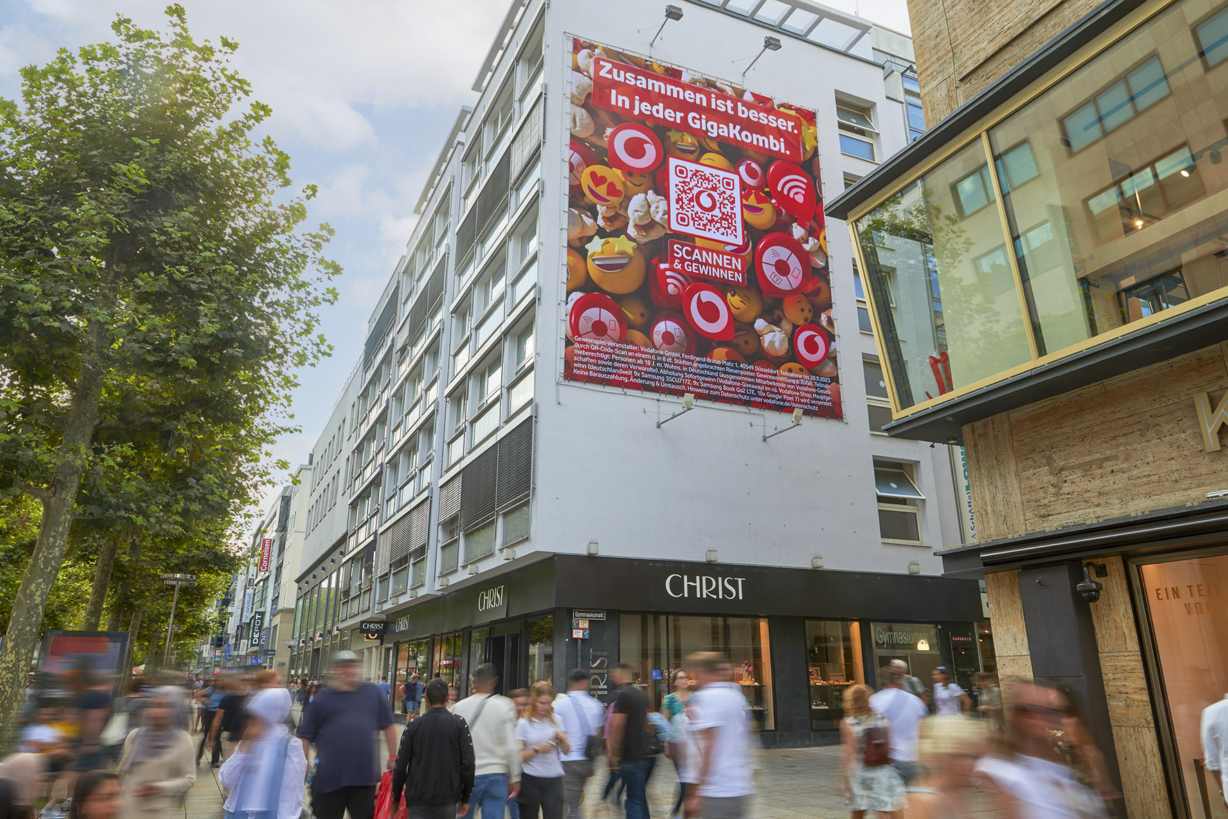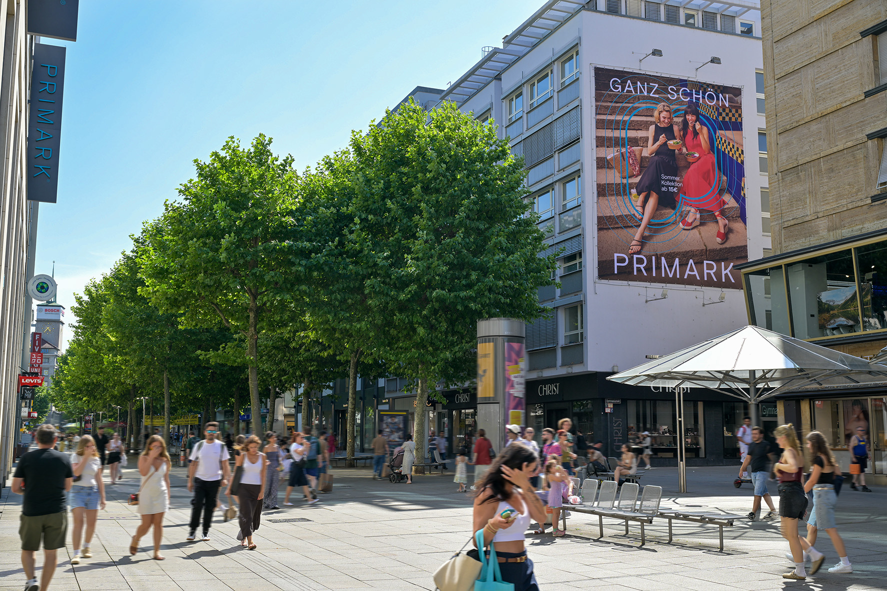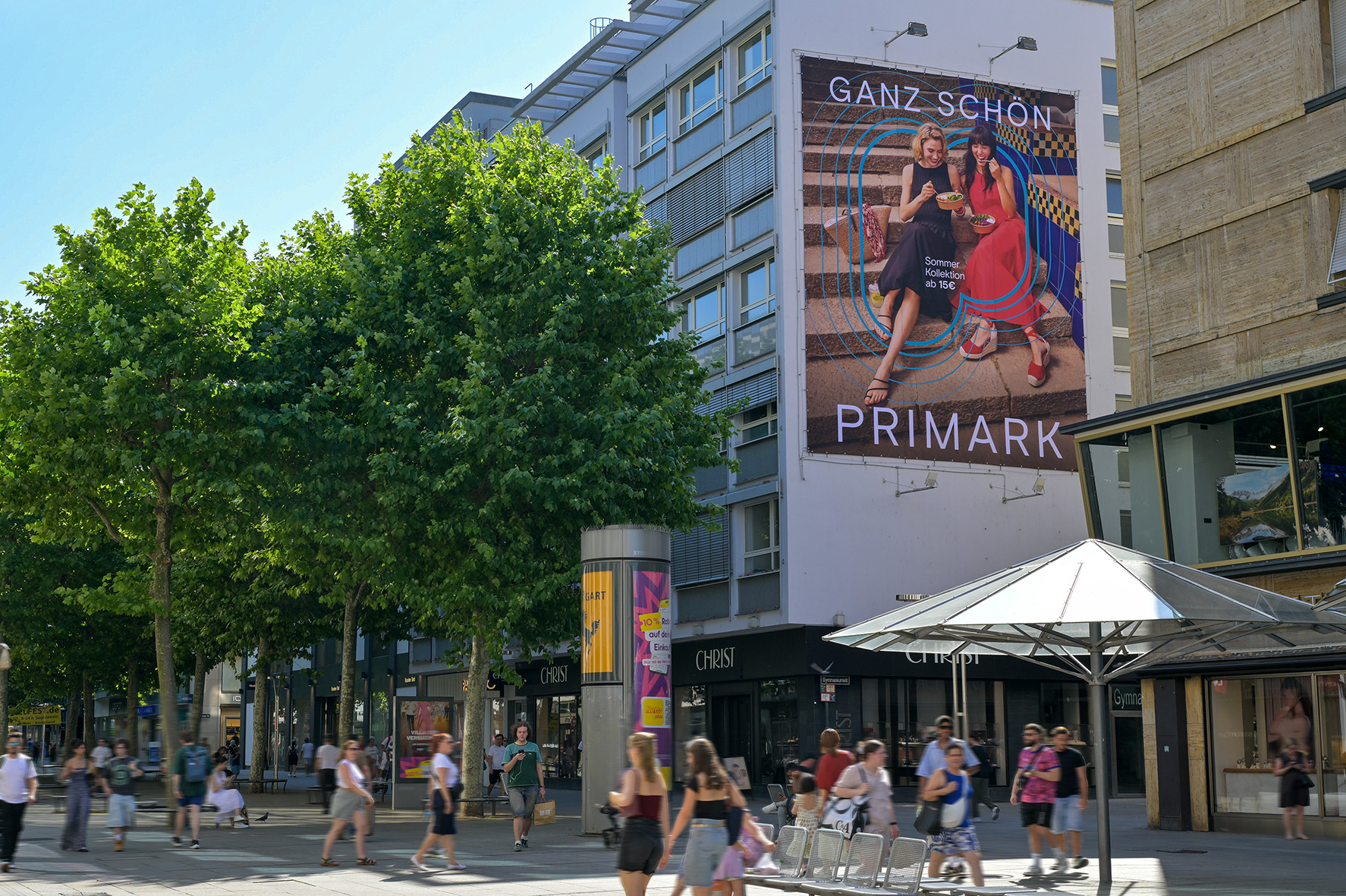 This BlowUP is located across from the Karstadt department store directly situated on the famous Königstraße. This main shopping street stretches more than 1.2 km from the Stuttgart Central Station right up to Rotebühlplatz. The very popular Königstraße attracts many daily visitors with such shops as Esprit, Stefanel, COS, H&M, Hugo Boss and Görtz. Marktplatz and City Hall as well as Stuttgart’s centrepiece - Schlossplatz - are only a few metres away. Also in direct vicinity: the famous Kaufhaus Breuninger (approx. 150 m), insurance companies, business offices, various restaurants and cafés. Additional viewers are generated by public transit stops, taxi stands and various car parks.