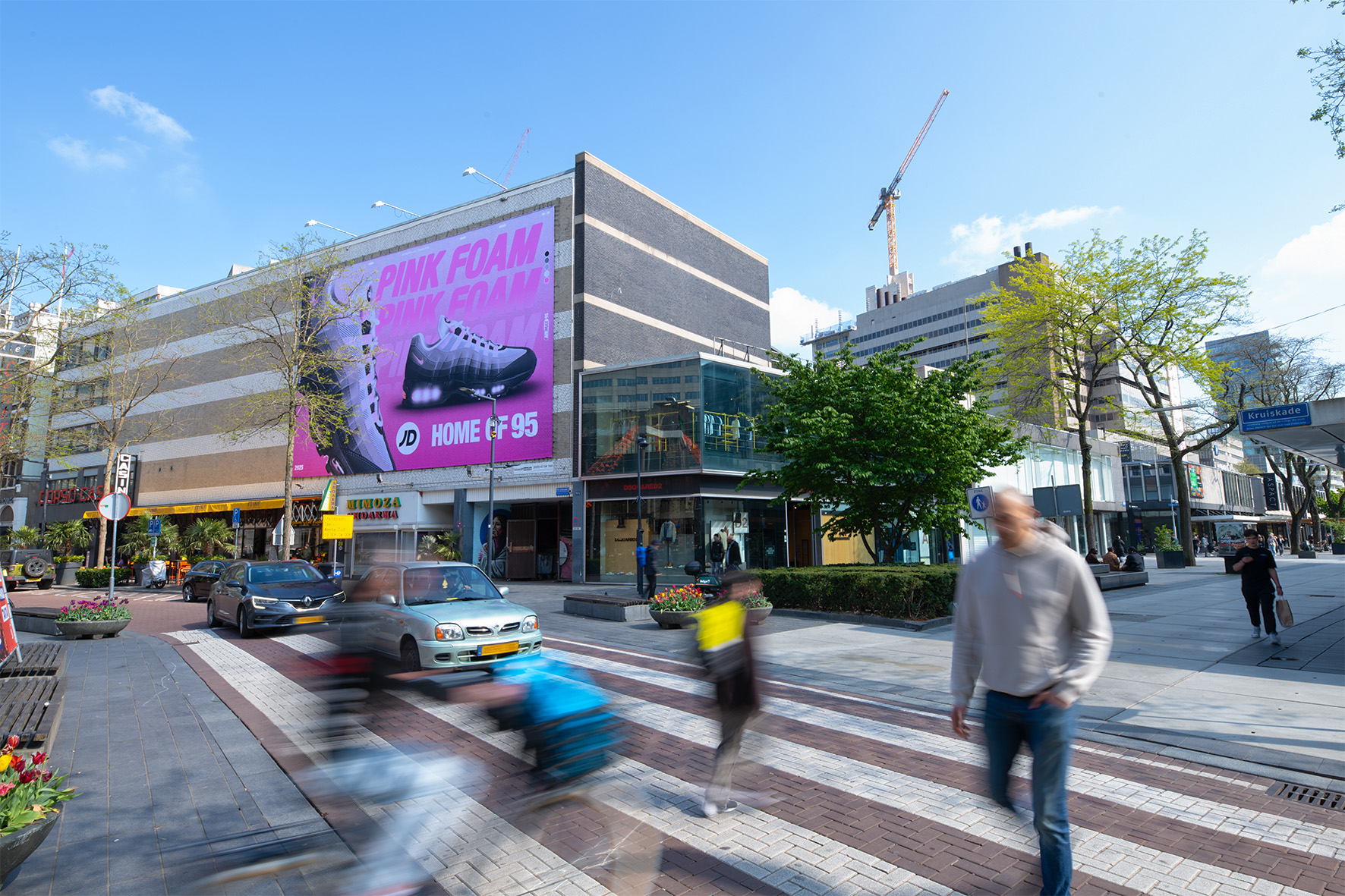 The Giant Poster on the façade of Kruiskade is a striking out-of-home advertising location in Rotterdam. With an impressive size of 170 m², the display dominates the street and reaches tens of thousands of passers-by every day. The location is strategically placed: close to the bustling Stadhuisplein, in one of the busiest shopping and entertainment districts, and within walking distance of the central station. This ensures your brand reaches a diverse mix of daily commuters, shoppers, tourists, and evening crowds. Thanks to its prominent position, the Giant Poster is clearly visible from over 200 metres away. For brands looking to truly establish their presence in the city, this is the ideal location.