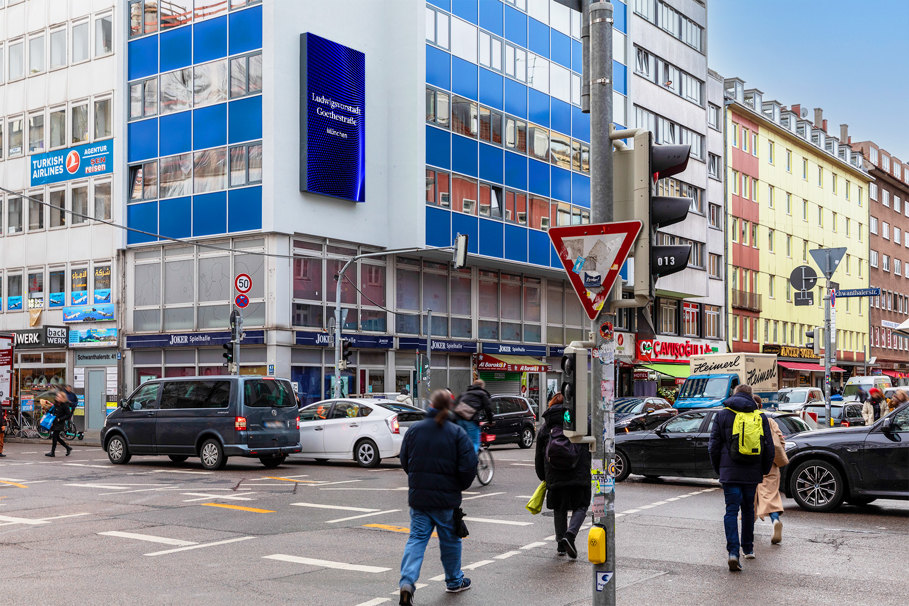 This screen is located in the centre of the diverse Ludwigsvorstadt district. The special flair of the district between Westend and Altstadt is characterised by a lively mix of shops, hotels and restaurants in a very small area. The screen's location directly at a highly frequented intersection and its proximity to hotspots such as the central station and Stachus make it an unmissable highlight in the heart of the Bavarian capital.