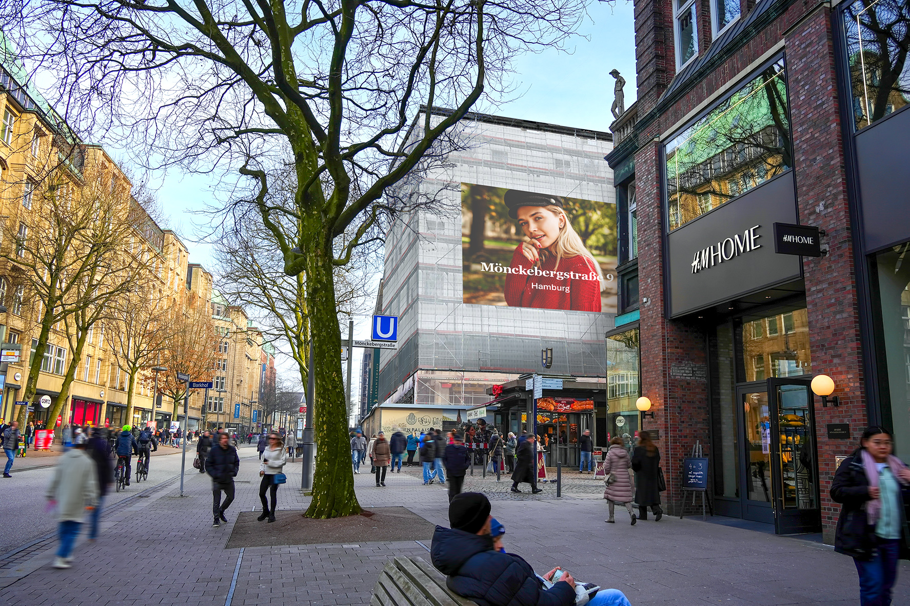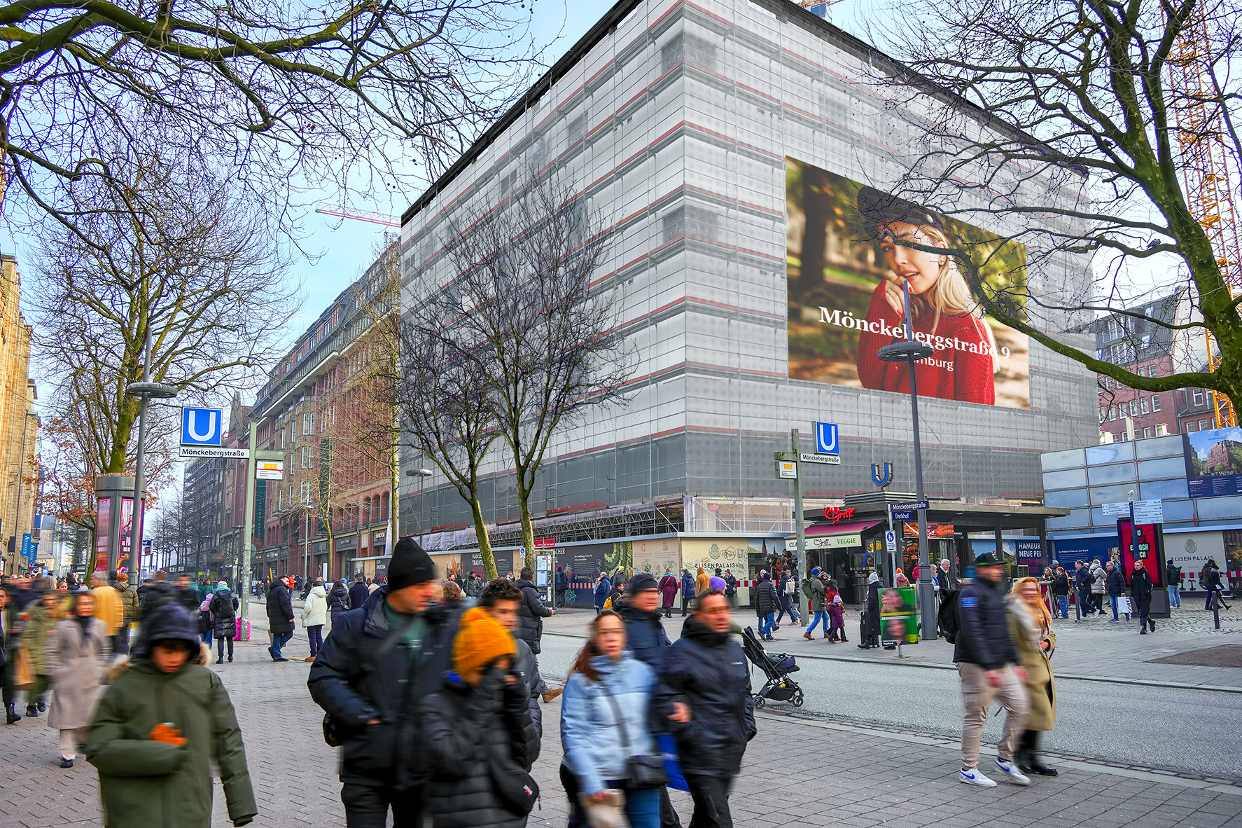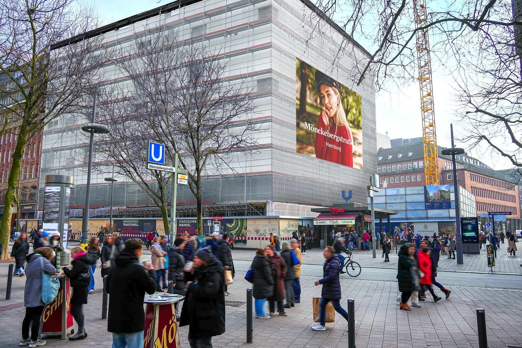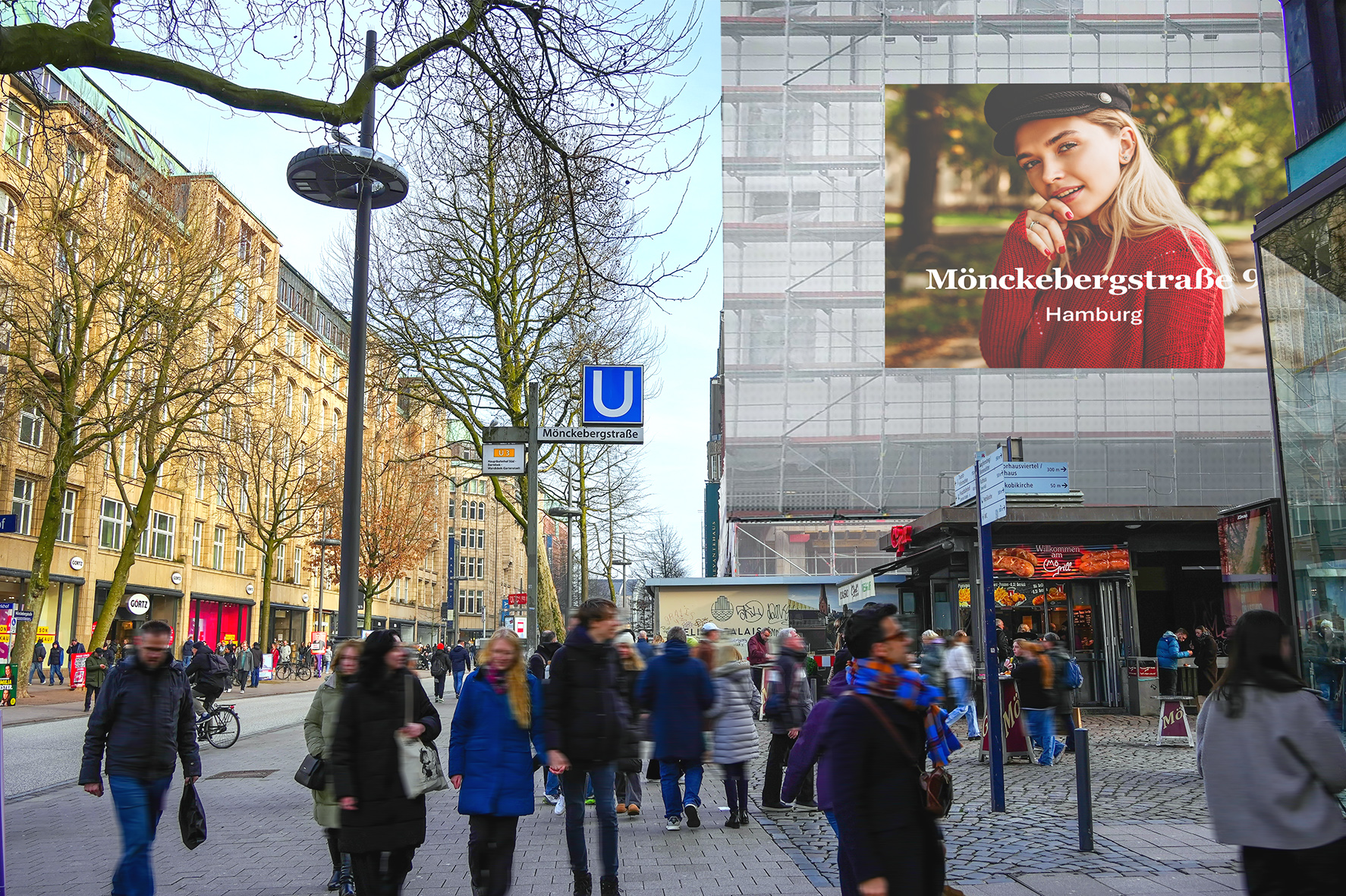Giant Poster highlight in the centre of Hamburg's promenade and shopping mile Mönckebergstraße - the hotspot for fashion-conscious shopping fans and trendsetters. Running centrally between the main railway station and the town hall, Mönckebergstraße is one of the ten most-visited and highest-turnover shopping streets in Germany: almost 130,000 shoppers and culture-loving passers-by are drawn here every day to the variety of well-known fashion outlets, restaurants, cafés and theatres.