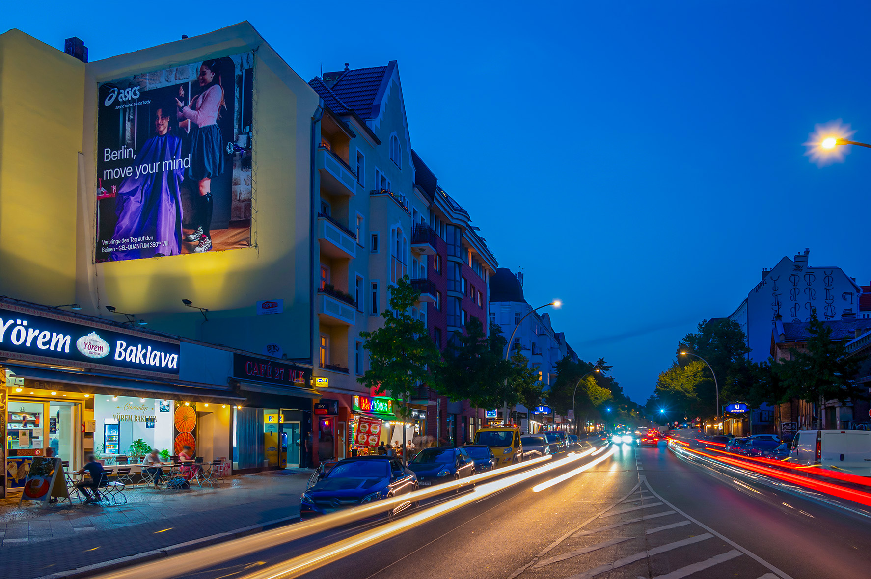 This Giant Poster offers brands the highest visibility and frequency on Hermannstraße in Berlin's Wilhelminian district of Schillerkiez, which is located in Berlin-Neukölln. Neukölln and Schillerkiez are very popular. The relaxed atmosphere, the close proximity to the popular Tempelhofer Feld park and the numerous cafés, bars and restaurants attract students, creative people and young families.