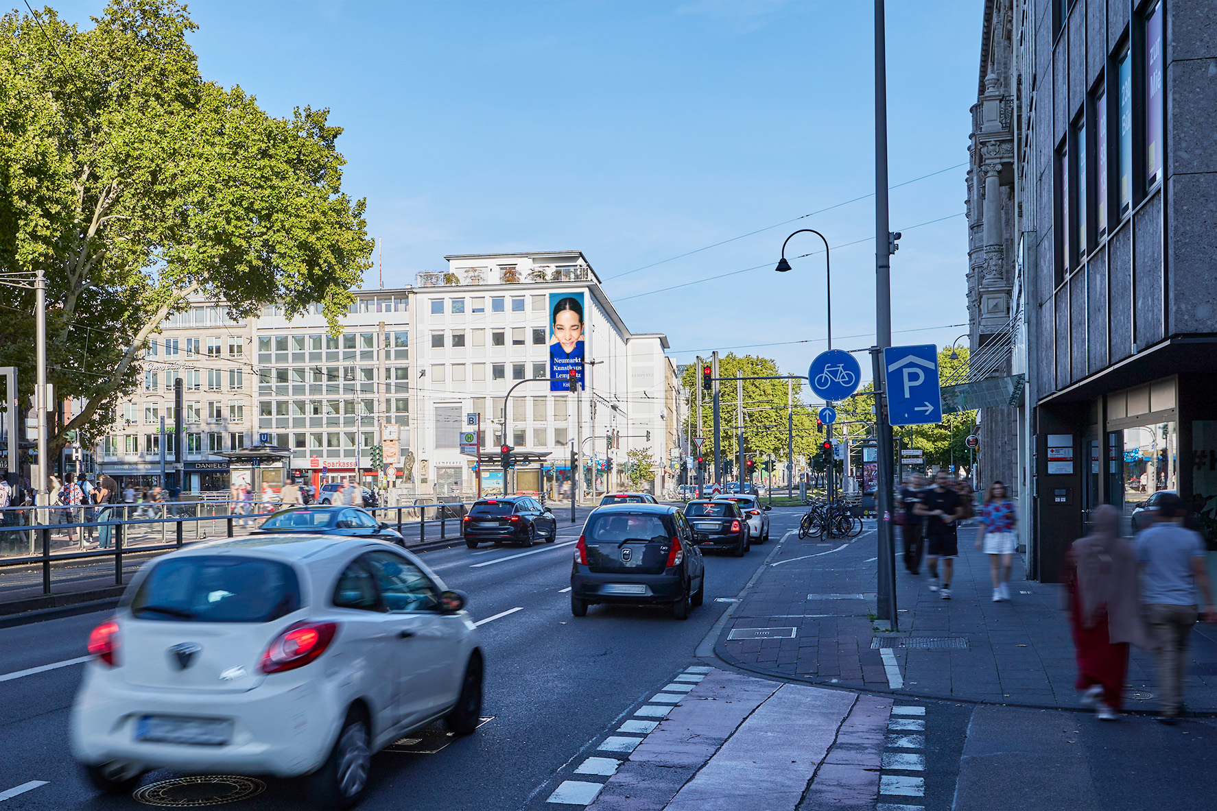 In a prime city location right at Neumarkt, one of Cologne’s most central and busiest squares, this Giant Poster guarantees maximum visibility. Here, the city’s main transport routes intersect, with subway, tram, and bus lines. As the busiest transportation hub in Cologne, countless commuters, travelers, and young locals pass by. The diverse audience is drawn toward the historic Old Town or to Ehrenstraße and Schildergasse, one of Germany’s most popular shopping streets.