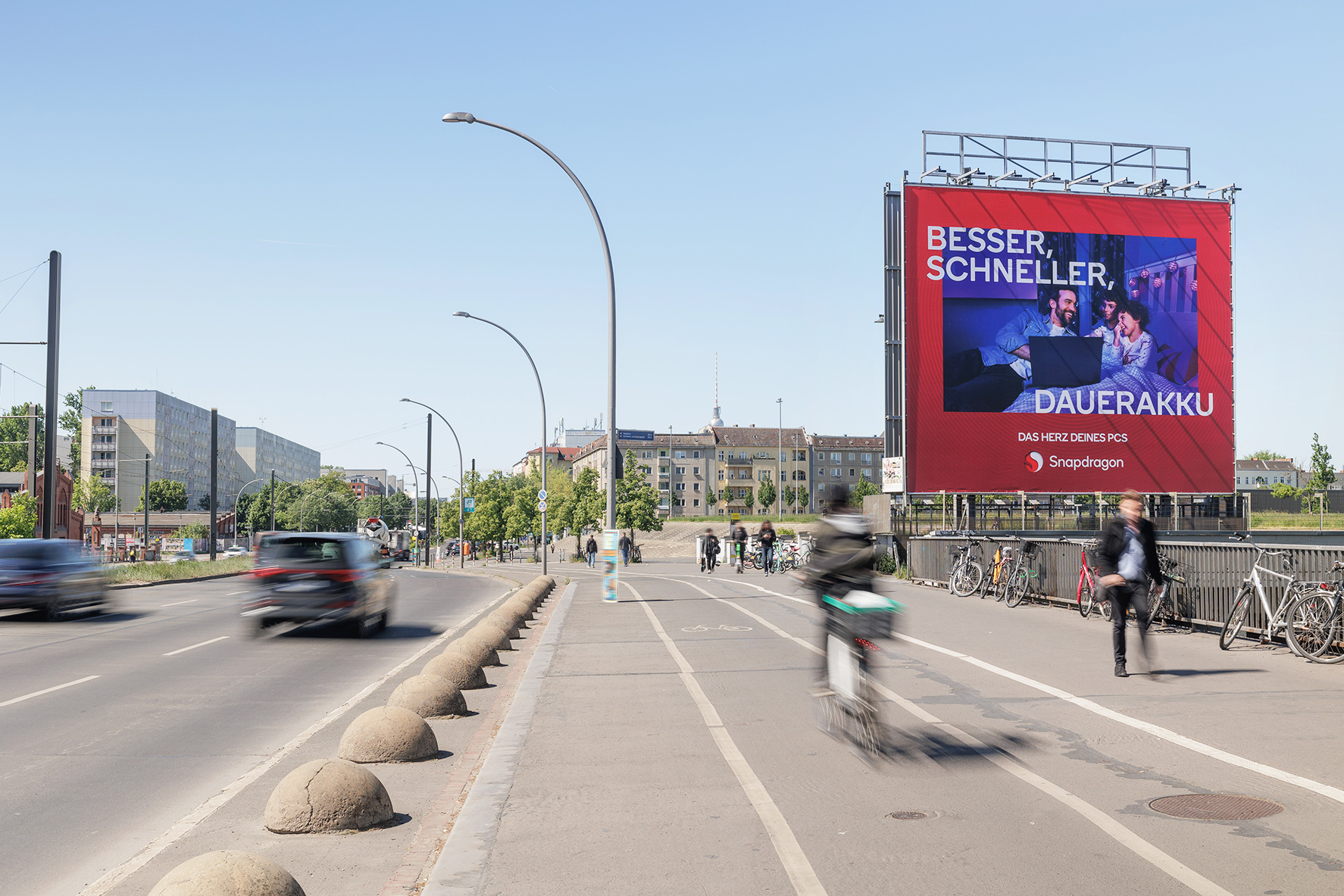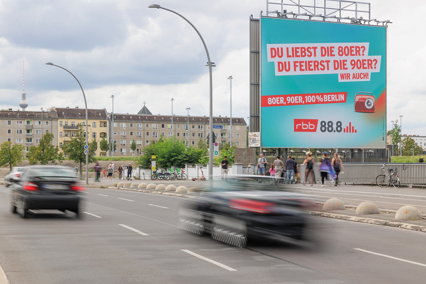Colourful, lively and diverse - that's Prenzlauer Berg right by the famous Berlin event location Velodrom. Young, outgoing people and sports fans make their way past the Giant Poster towards the city centre and the Velodrom, where concerts and major events regularly take place. The freestanding location of the Giant Poster on the highly frequented Landsberger Allee makes it very visible to the numerous motorists and pedestrians from a distance of over 500 metres.