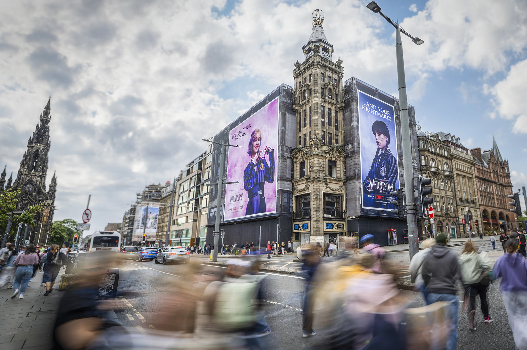 Our 509qm Princes Street Giant Poster is the most dominant banner positioned on Edinburgh’s main shopping street. This prime location is a hub for luxury retail, located near Multrees Walk, Edinburgh’s premier luxury shopping destination, home to Scotland’s only Harvey Nichols, Louis Vuitton, and a range of other exclusive fashion brands. Another key shopping destination is St James Quarter, a renowned complex offering world-class retailers, upscale bars, restaurants, and entertainment.