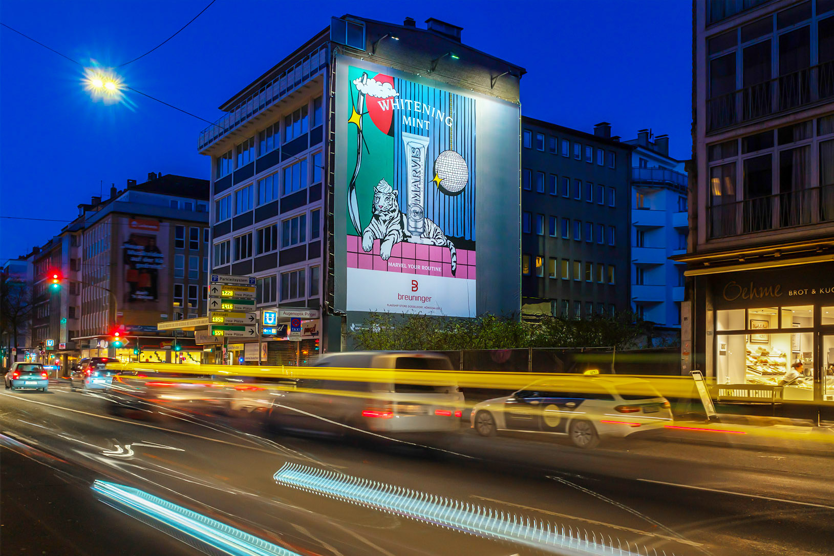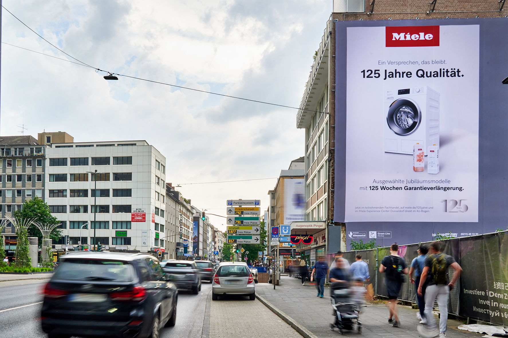 This Giant Poster is situated in an optimum city-centre location, at the junction of the shopping streets Oststraße, Steinstraße and Friedrich-Ebert-Straße. Steinstraße leads directly to the legendary Königsallee, which is packed with well-known luxury brands such as Chanel, Gucci, Cartier, Armani, BOSS, Calvin Klein and Tommy Hilfiger – the premiere meeting place for fashion lovers. The proximity to the city centre and the main station, as well as the numerous hotels nearby, makes the area a popular destination for business professionals and holiday travellers alike. Immermannstraße is also known as Little Tokyo on the Rhine, and is home to numerous Asian restaurants and bars offering Tokyo flair and everything the Japanese heart desires right in the middle of the Rhineland.