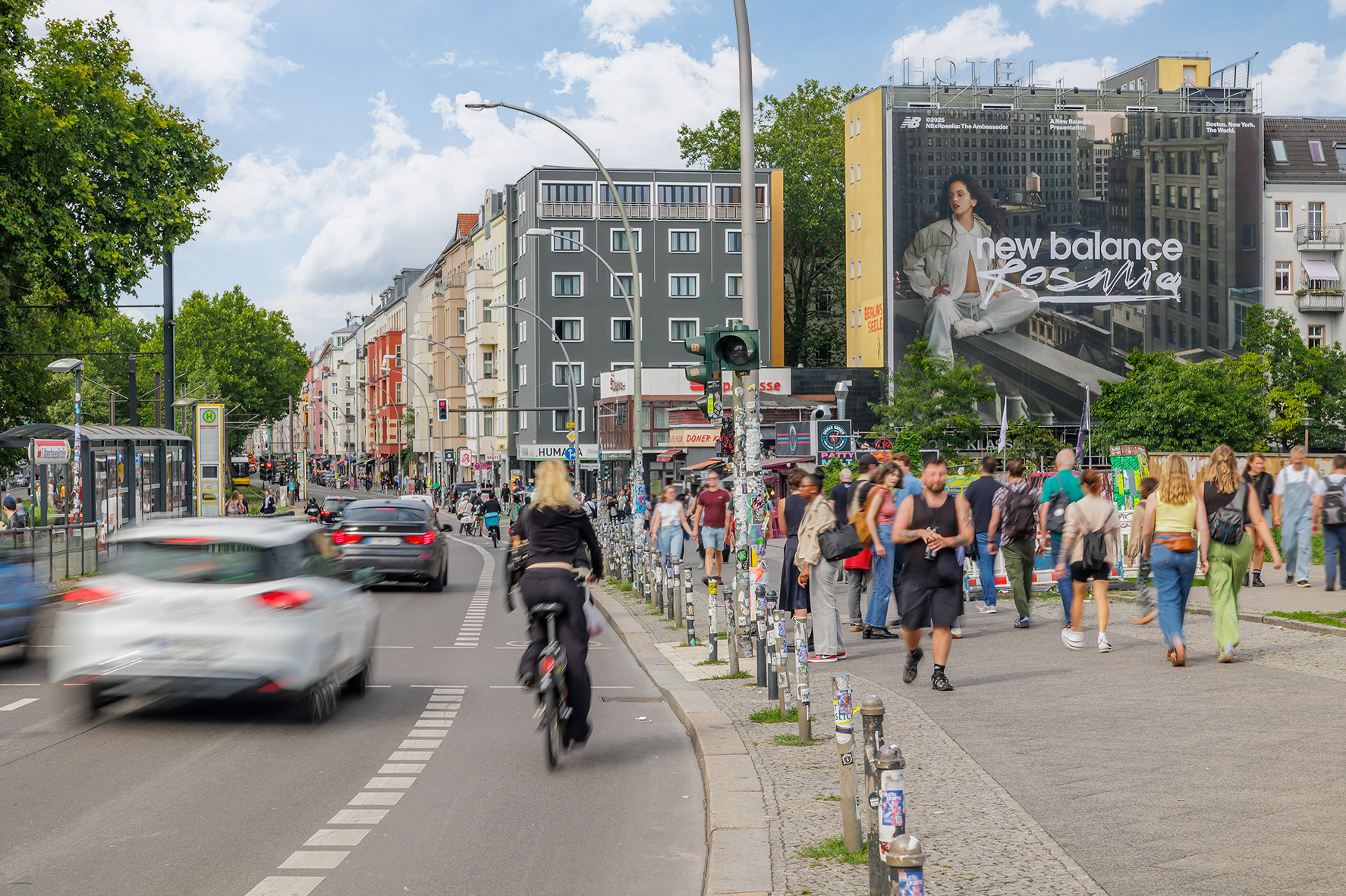 This impactful giant poster is located at the high-traffic intersection of Warschauer Straße and Revaler Straße – one of the main thoroughfares in the heart of Friedrichshain. The trendy district is known for its creativity, club culture, and urban lifestyle, attracting a young, urban target audience every day. The nearby Warschauer Straße station is a central hub for countless night owls, art and culture enthusiasts, and tourists heading into Berlin’s vibrant nightlife. In the immediate vicinity are hotspots such as the Uber Arena, the RAW-Gelände, the legendary Berghain club and the East Side Gallery.