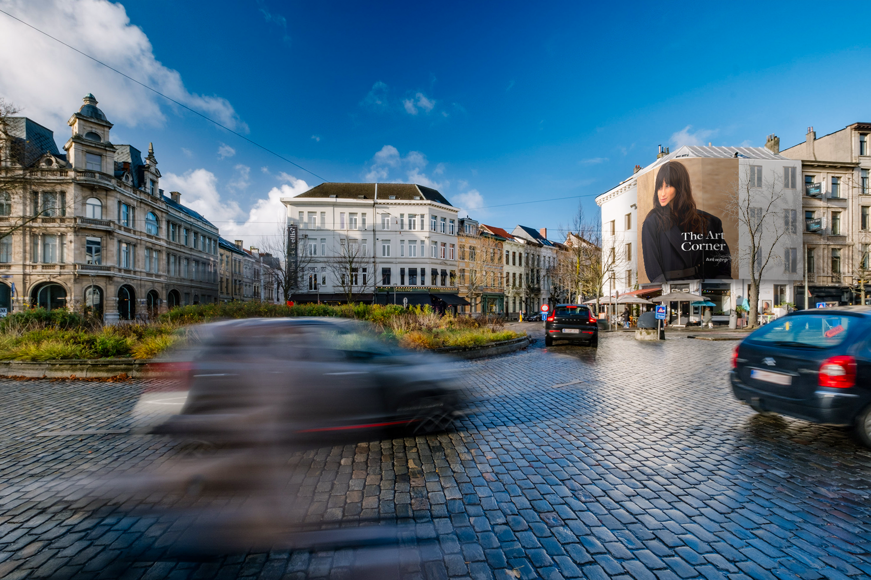 The corner location is situated in the trendy quarter 'Zuid', hosting numerous events throughout the year, attracting a diverse target audience. The area around this site is known for its exclusive housing spaces and thus for a multitude of hip, successful and trendy people. With a impact range for pedestrians, cyclists and general traffic, this impressive site ensures exellent visibility and extra long viewing times. beiing surrounded by numerous terraces of the finest bars,clubs and restaurants Antwerp has to offer, this location forms the centre of a vibrant leisure time area.