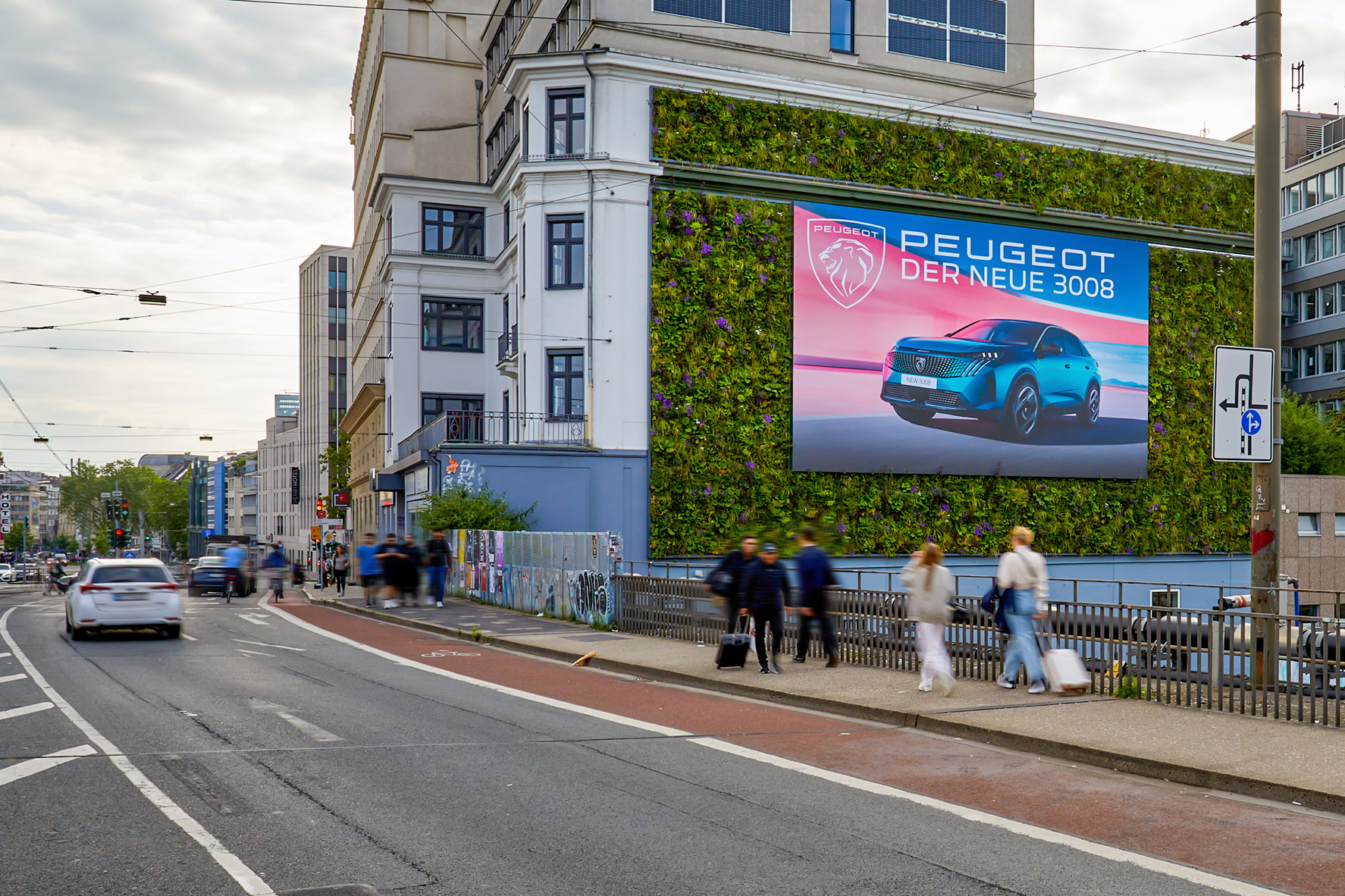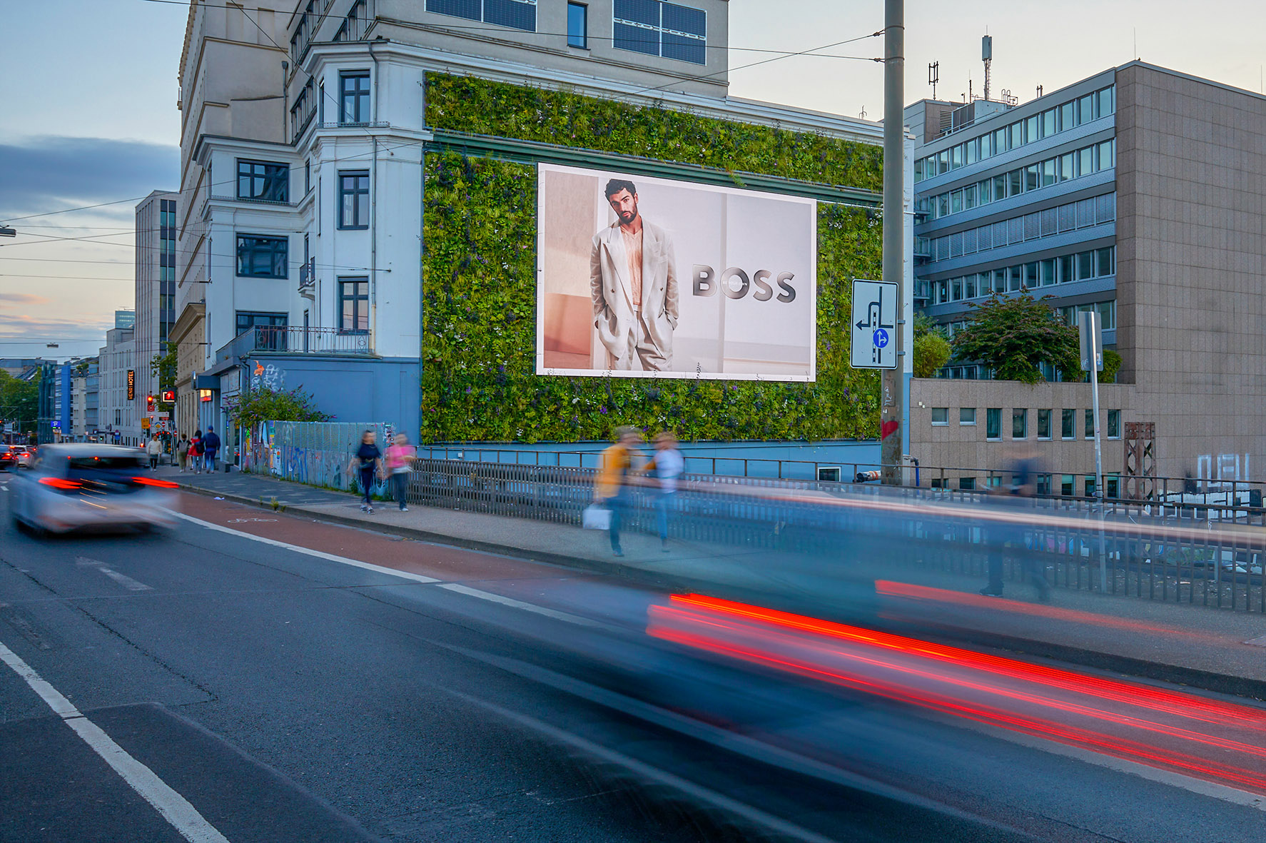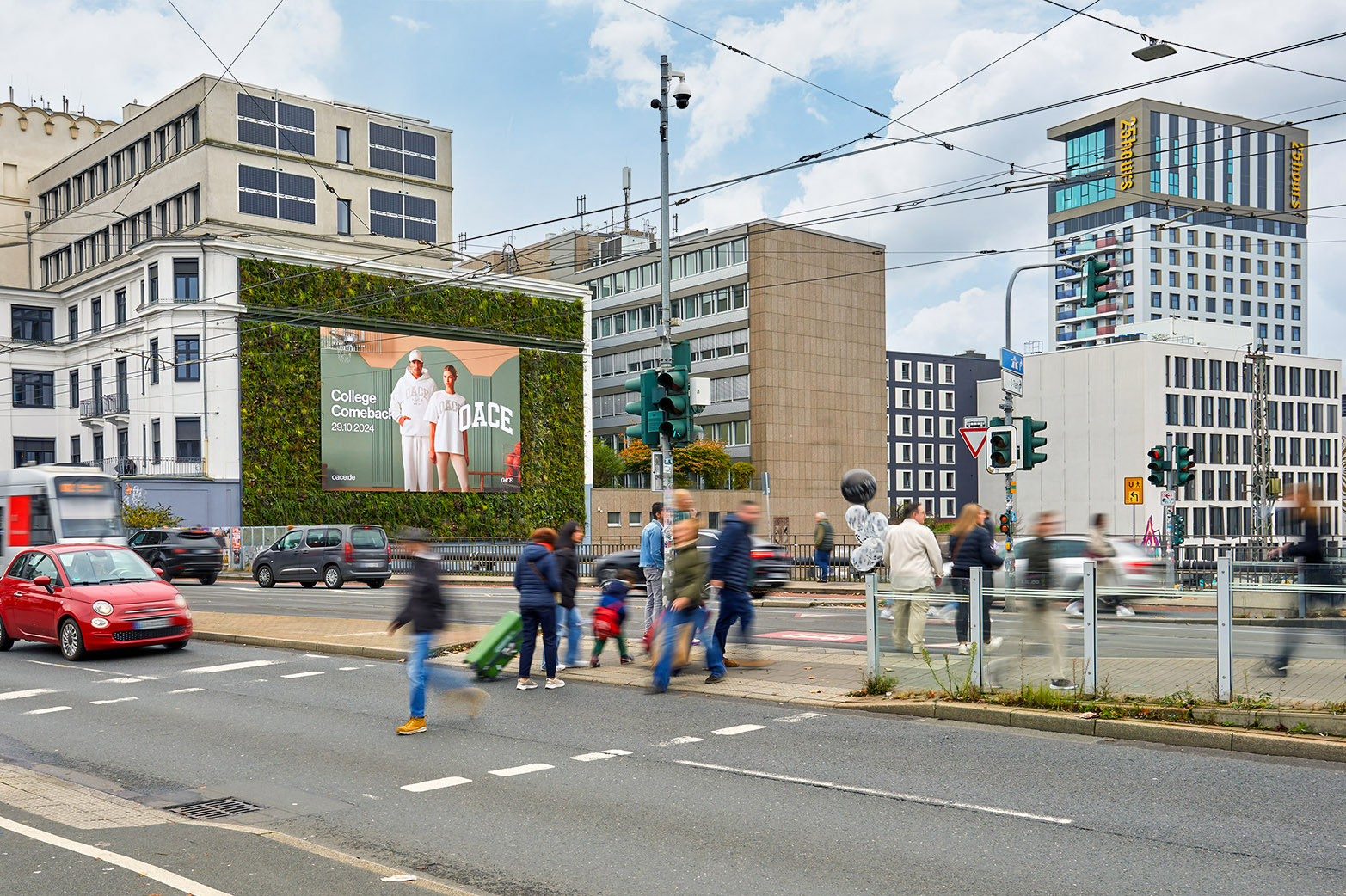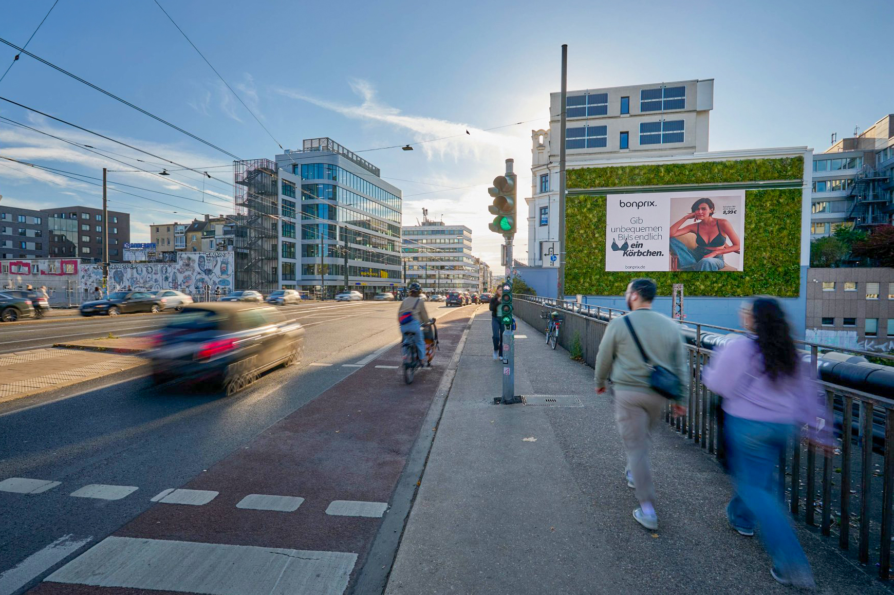 The Green Digital combines the best and most innovative that our DOOH Green Media portfolio has to offer: a 100 m² state-of-the-art digital screen embedded in a 180 m² Vertical Garden - powered by solar energy! Perfectly visible in the middle of Düsseldorf city center at the highly frequented Wehrhahn. The area has undergone a massive upgrade in recent years: the high-quality district "Le Quartier Central" ensures brisk traffic with 2,300 apartments and commercial properties. Various well-known advertising and media agencies as well as the casually elegant hotel "25 Hours" are also based here, which attract a hip and trend-conscious crowd. Located on the three-lane Wehrhahn, The Green Digital also leads directly to Schadowstrasse, one of the most popular shopping streets in Germany. Schadowstrasse and Königsallee are within walking distance and are promenades for pleasure-seekers and fashionistas.