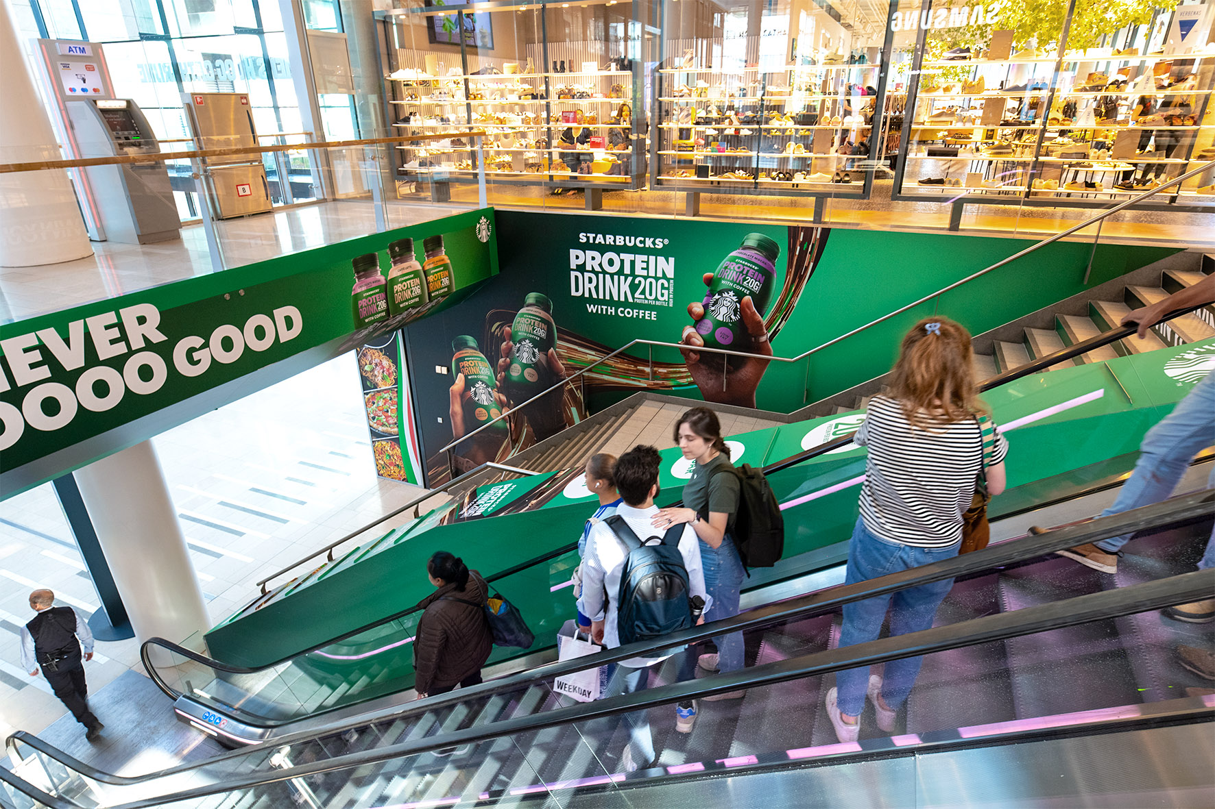 Make a brand statement in shopping mall Hoog Catharijne, the busiest retail hub in the Netherlands, with full wrapping of the Stairs. This location concerns the South side, but can be combined with the North side. The 'Stairs' are a huge eye-catcher that passers-by cannot ignore, especially in combination with stickers on the walls. Upon arrival on the first floor, a matching digital campaign on the screen reinforces The South Mile; the perfect complement to this brand experience.