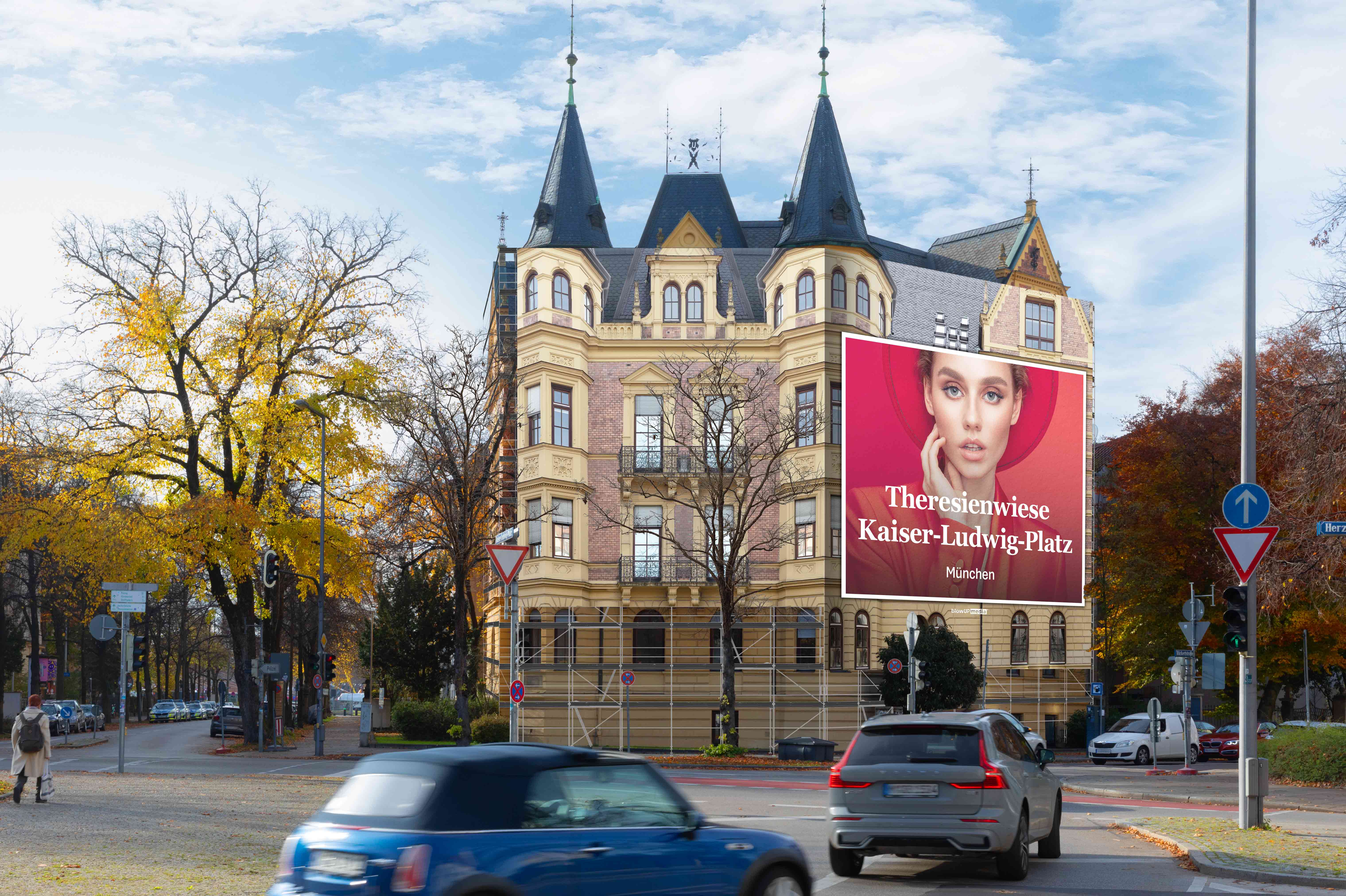 The Giant Poster is located in the heart of Isarvorstadt, one of Munich’s most charming and exclusive residential districts. At Kaiser-Ludwig-Platz, your message reaches thousands of commuters and locals every day as they move through the city. Positioned at the center of the traffic flow between the main train station and Lindwurmstraße, the poster enjoys maximum visibility thanks to the traffic light infront of it. The sophisticated surroundings are home to successful managers, entrepreneurs, and academics with an appreciation for quality and culture, people who value both urban comfort and an attractive environment.
